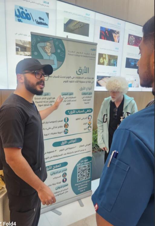As part of the community service initiatives of Fakeeh College for Medical Sciences, FCMS staff and students conducted a hospital awareness campaign titled. The event aimed to educate patients about the link between anxiety and insomnia, highlighting their symptoms, causes, and mutual influence. Brochures and banners were prepared and distributed to raise awareness about prevention and management strategies. Students also organized giveaways and engaged with patients through informative discussions.
