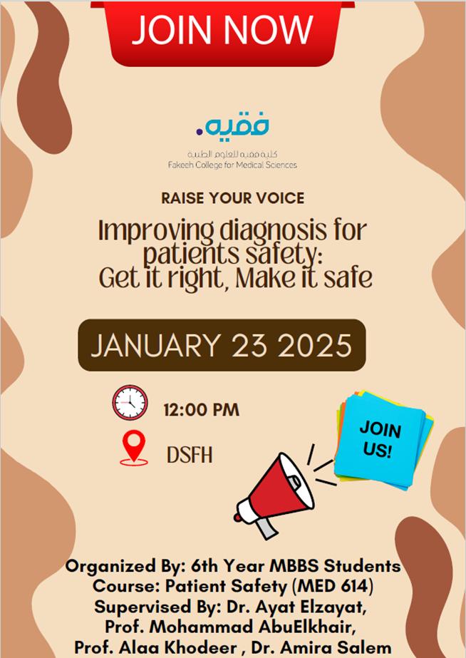 A hospital session, “Improving Diagnosis for Patient Safety: Get it Right, Make it Safe,” trained physicians, nurses, and allied health professionals on diagnostic accuracy. Using lectures, discussions, and simulations, it addressed diagnostic errors, contributing factors, and strategies, highlighting interprofessional collaboration, patient involvement, and clinical decision-support tools to enhance safe diagnostic practices.