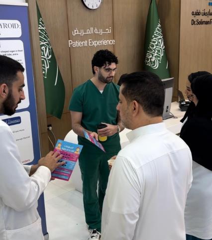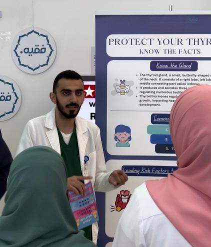 As part of the community service initiatives of Fakeeh College for Medical Sciences, FCMS staff and students conducted Thyroid Disorders Awareness at DSFH to educate patients and visitors about thyroid function, symptoms, and management of related disorders. The event included interactive discussions, posters, and Q&A sessions emphasizing the importance of early detection, regular screening, and healthy lifestyle practices.