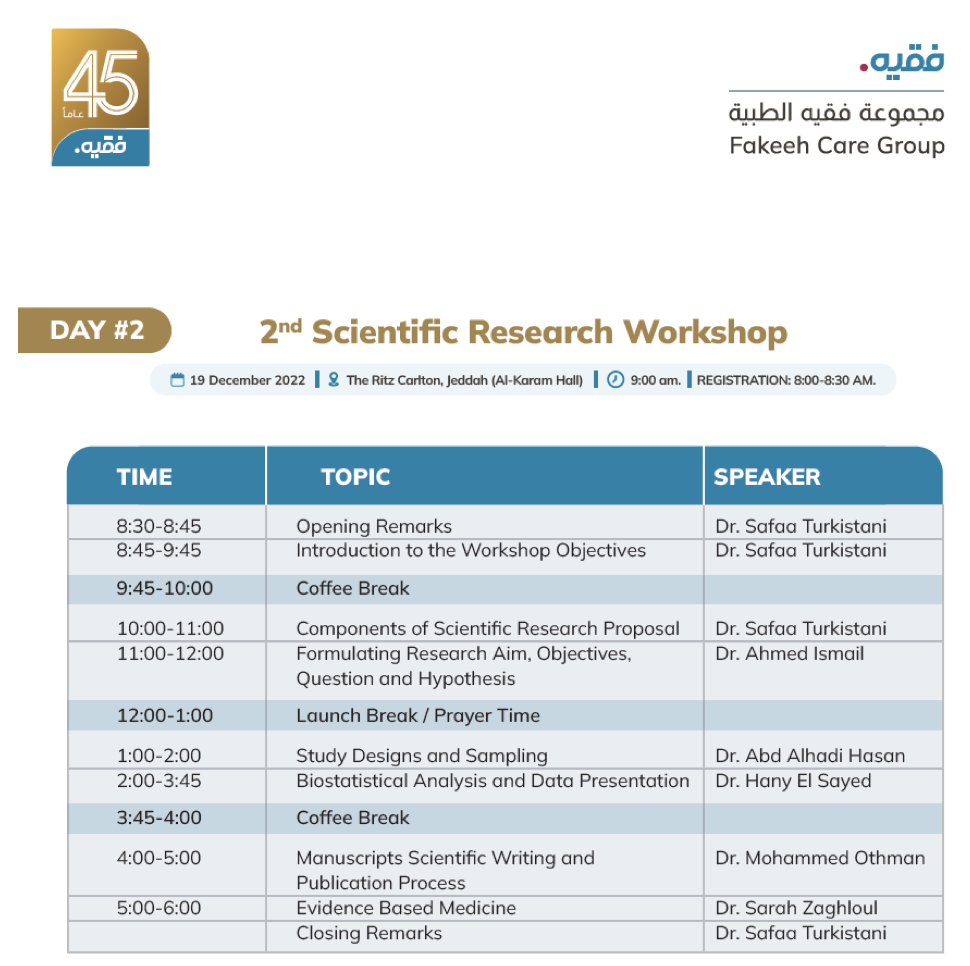 The 2nd Scientific Research Workshop, organized as part of the 1st Fakeeh Care Annual Congress, was designed to strengthen the research capacity of healthcare professionals and academic staff across various disciplines. Held on December 19th, 2022, at The Ritz-Carlton, Jeddah, the workshop provided an intensive, one-day program combining theoretical foundations with practical applications in medical and scientific research.