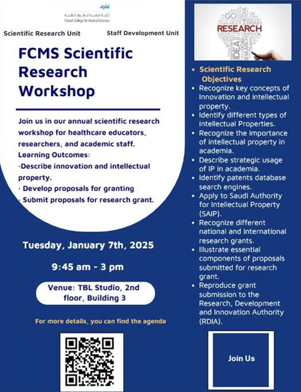 Based on Saudi vision 2023 that encourage production of high-quality research and according to Fakeeh College for Medical Sciences (FCMS) mission and vision, FCMS is keen to empower its academic staff with research knowledge and skills necessary for their progress. In addition, enhancing research environment and its infrastructure is part of FCMS mission and one of its strategic goals and Consequently, FCMS integrates Scientific Research Workshops in its annual calendar targeting faculty staff believing in the importance of research in medical sciences.