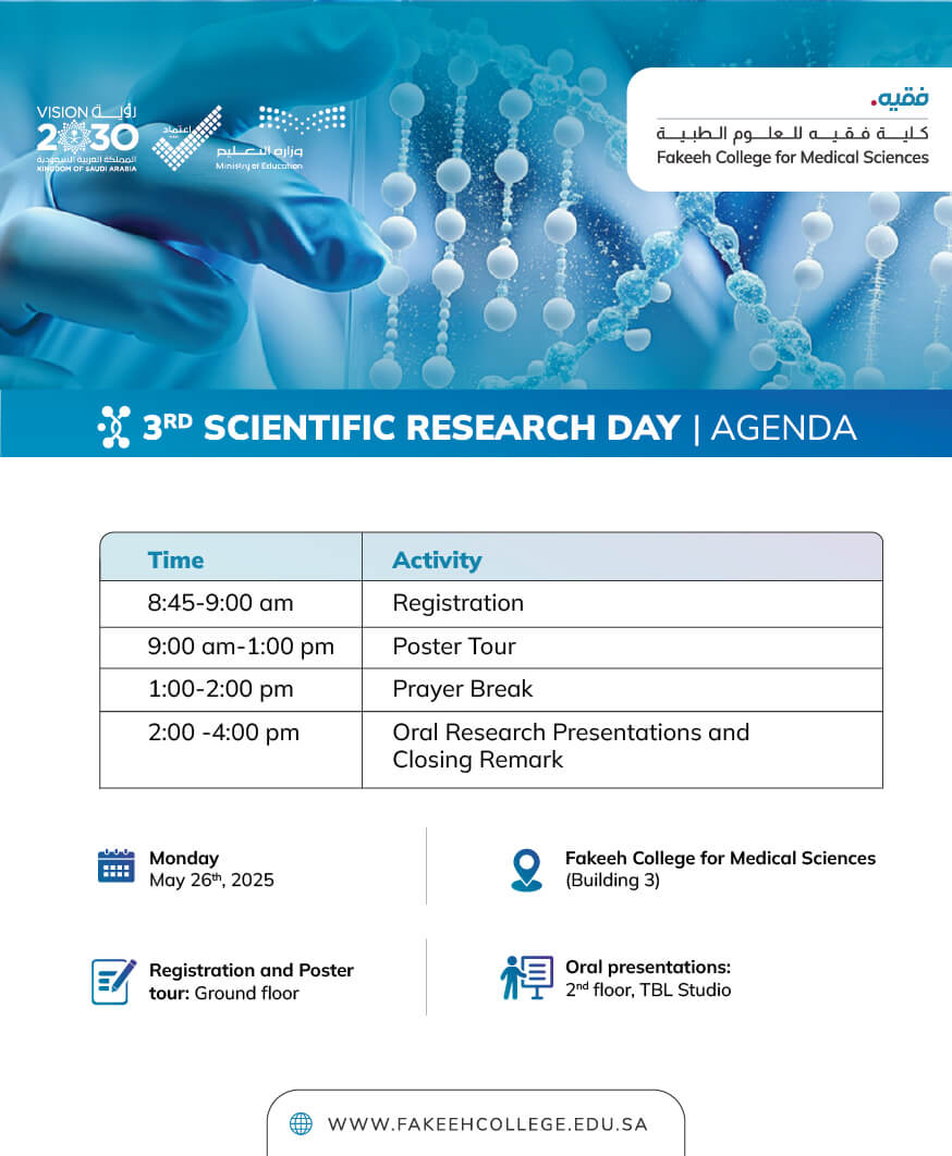 Scientific research is a cornerstone of any educational institution where teaching and learning, discovery, creativity, and community engagement are “core elements” to the mission of Fakeeh College for Medical Sciences (FCMS). FCMS management has a vision to be one of the leading medical sciences colleges in Saudi Arabia fostering innovation and achieving educational and training excellence. In order to achieve the FCMS mission, to prepare qualified compassionate graduates in medical and health specialties according to national and international educational standards, contributing to scientific research and community services, scientific research unit developed a scientific research day.