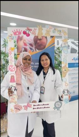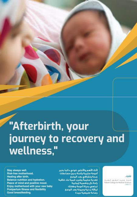As part of the community service initiatives of Fakeeh College for Medical Sciences, FCMS staff and students conducted an awareness session at the OB Clinic waiting area focusing on postpartum recovery and wellness. The session aimed to educate postpartum and pregnant women about physical and emotional changes after childbirth, and proper self-care. A brief interactive talk and visual materials were used to explain the importance of mental health and physical recovery during the postpartum period. Informative brochures were distributed, and small giveaways were offered to engage the participants and create a supportive environment.