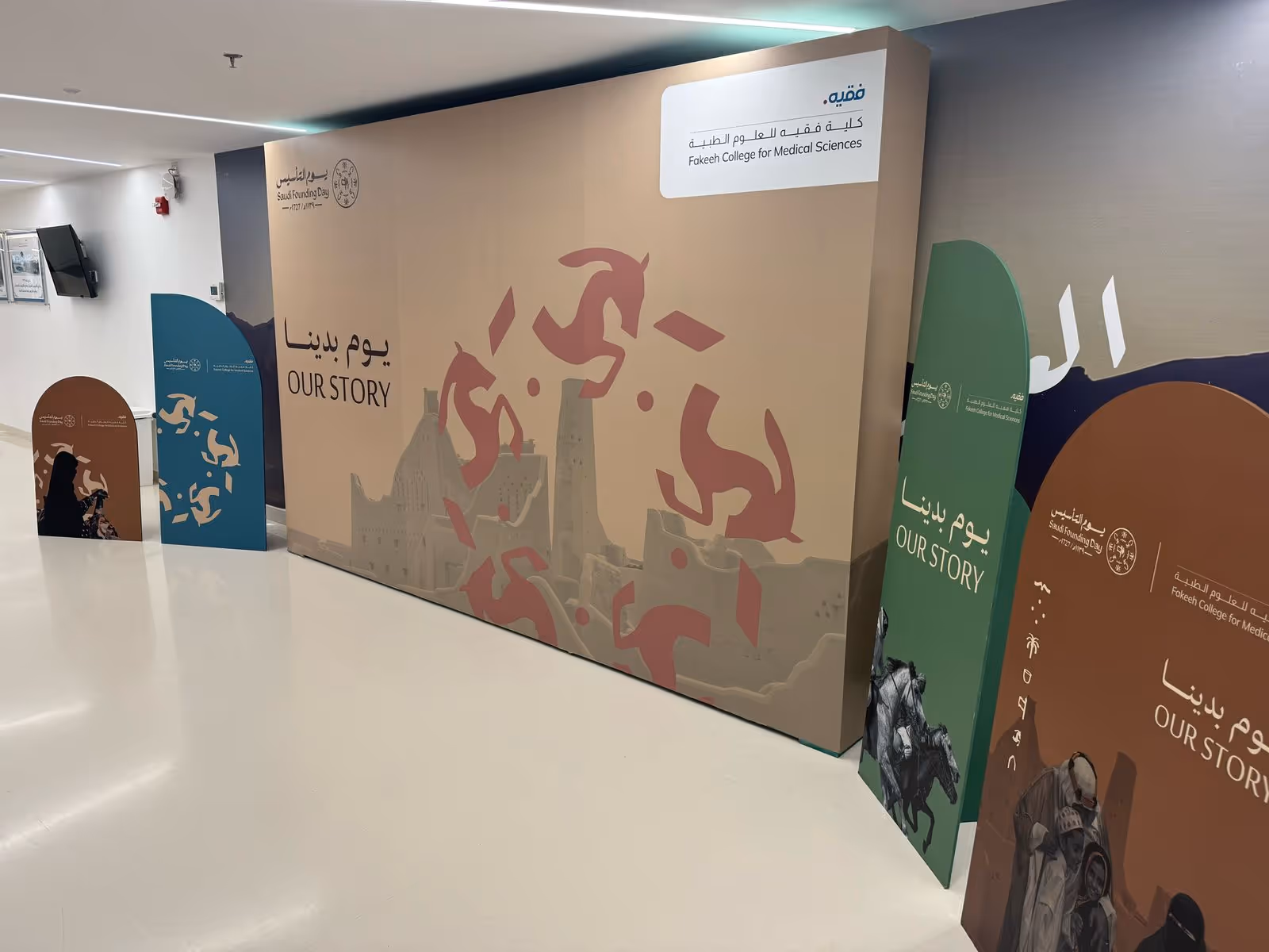 🔹 Saudi Heritage Exhibition: The college halls were adorned with decorations inspired by the Kingdom’s history, showcasing historical artifacts and artistic paintings that highlighted the stages of Saudi Arabia’s foundation.