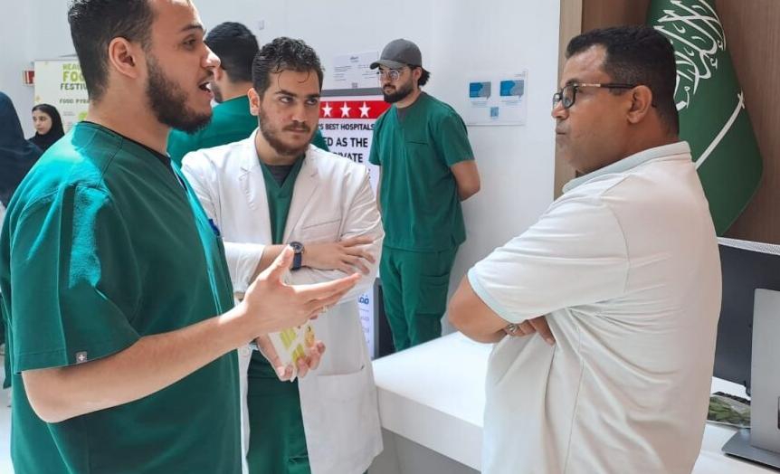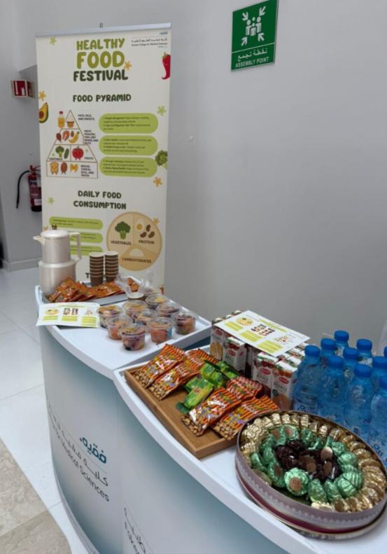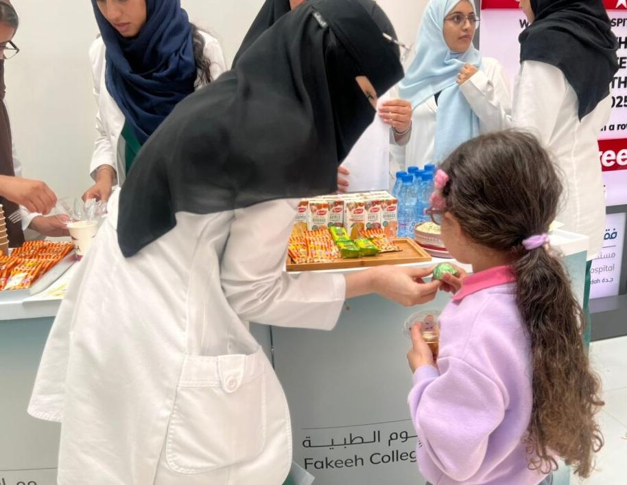 As part of the community service initiatives of Fakeeh College for Medical Sciences, FCMS staff and students conducted Healthy Foods and Food Pyramid Awareness at DSFH to educate visitors about balanced nutrition and healthy eating habits. The event included interactive discussions, informative posters, and brochures highlighting the components of the food pyramid and the importance of proper nutrient distribution.