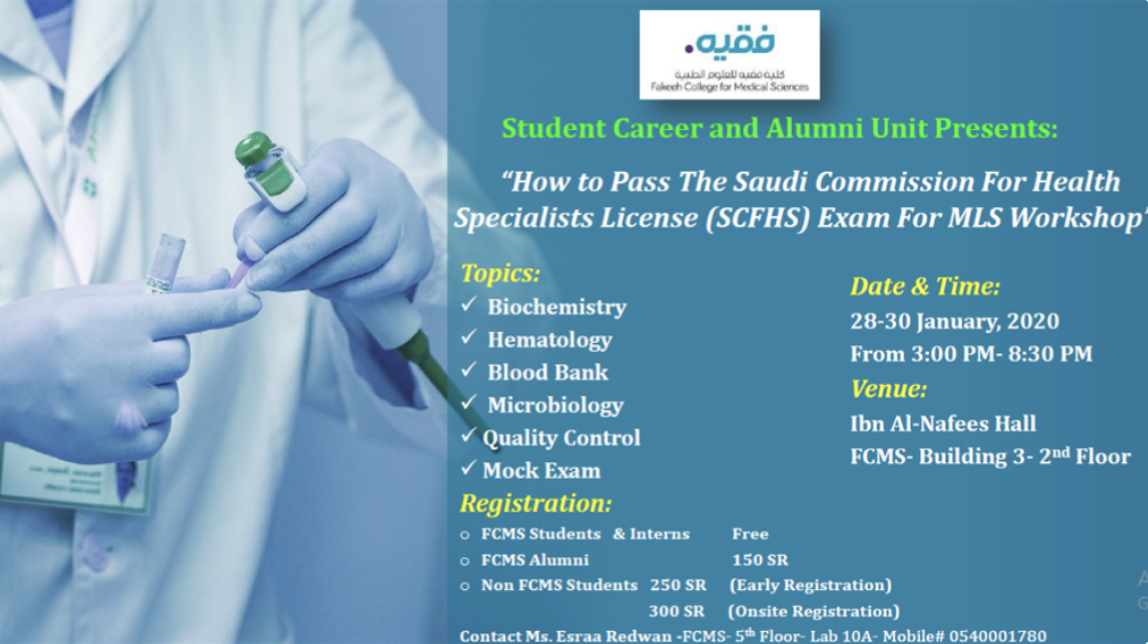 Student Career and Alumni unit at Fakeeh College for Medical Sciences FCMS organized Orientation Workshop on Structure of MLS SCFHS license Exam for Medical Laboratory Sciences Alumni on (January, 2019). These events included expert speakers and previous graduates to share their recommendations for their fellows.