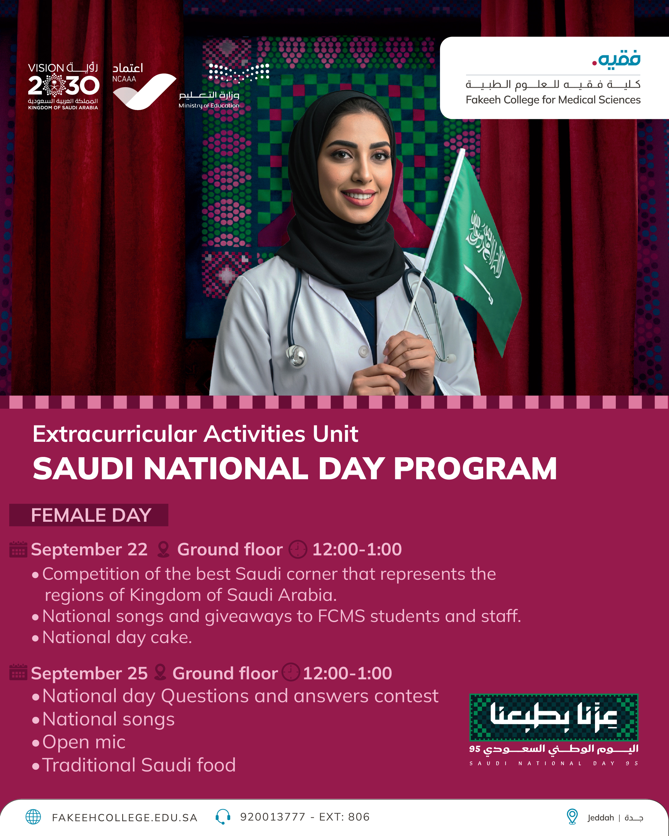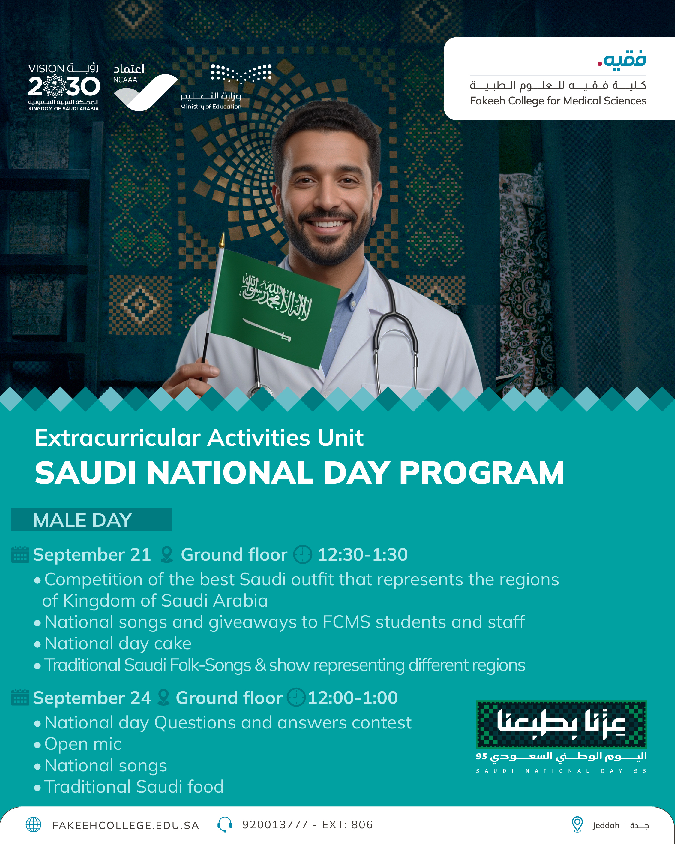 Between September 21 and 30, 2025, FCMS celebrated Saudi National Day with a series of engaging activities for students, faculty, and administrative staff. The events aimed to build national pride, strengthen a sense of belonging, and raise awareness of Saudi Arabia’s rich history and culture. Through interactive competitions and cultural showcases, the celebration created an inclusive and lively environment that brought the college community together to honor the Kingdom’s heritage.