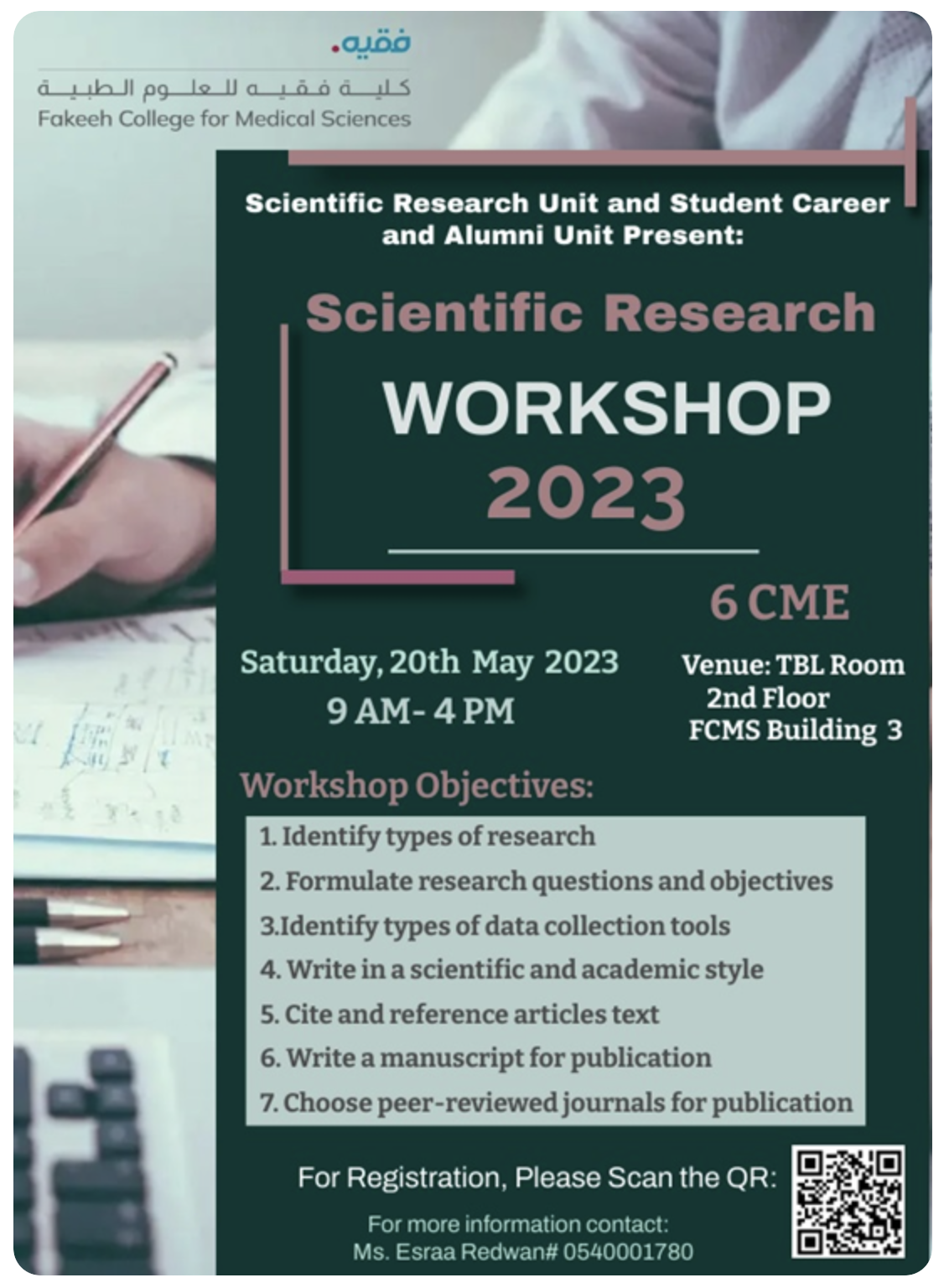 Student Career and Alumni unit in collaboration with a Scientific Research Unit at Fakeeh College for Medical Sciences FCMS organized Scientific Research Workshop on the 20th of May 2023. This workshop included the following topics: