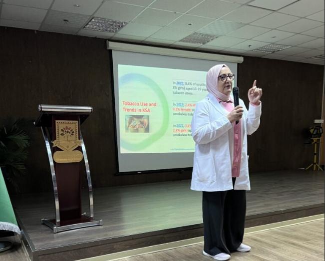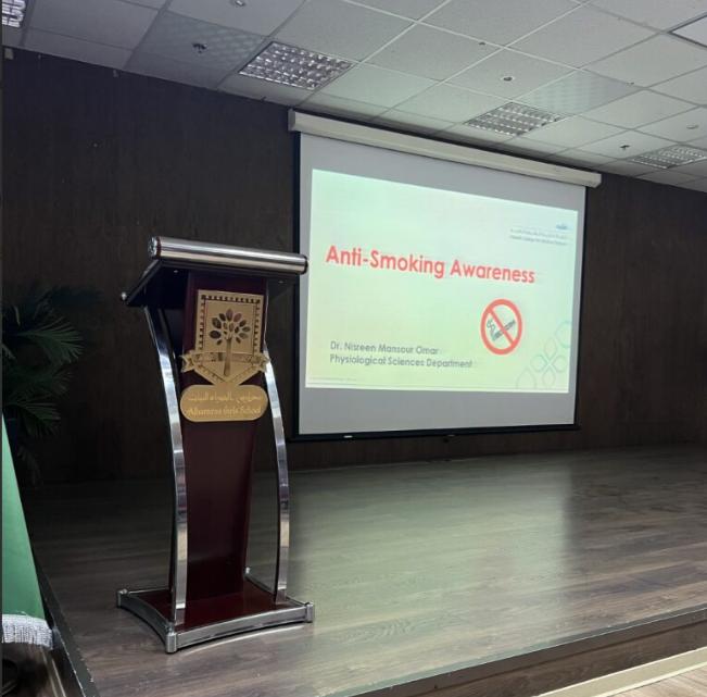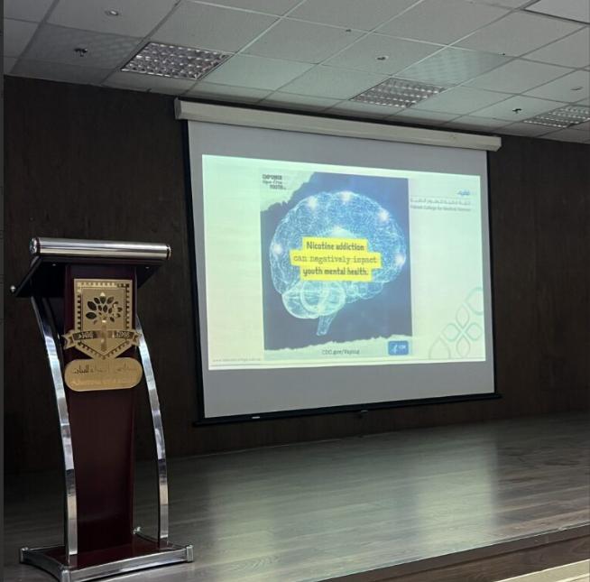 As part of the community service initiatives of Fakeeh College for Medical Sciences, FCMS staff members conducted an awareness session at Al Hamraa International School about the harmful effects of smoking and vaping. The interactive lecture aimed to educate high school students about myths and facts related to tobacco and vape use, highlighting their health risks. Informative discussions, real statistics from WHO and the Saudi Ministry of Health, and visual materials were used to raise awareness and promote a healthier lifestyle among students. FCMS offered some giveaway for participation to encourage engagement.