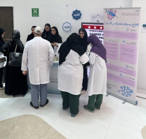 As part of the community service initiatives of Fakeeh College for Medical Sciences, FCMS staff and students conducted Vaccination and Antibiotic Awareness at DSFH to educate the public about the importance of vaccinations and the responsible use of antibiotics. The activity featured informative posters and giveaways to engage visitors, emphasizing how vaccines prevent infectious diseases and how misuse of antibiotics contributes to resistance. Participants received educational materials explaining proper antibiotic practices and the science behind immunization.