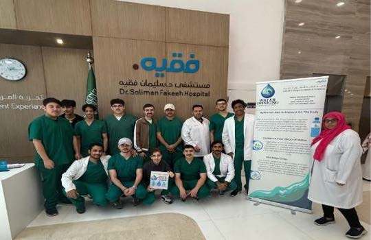 As part of the community service initiatives of Fakeeh College for Medical Sciences, FCMS staff and students conducted Water Drinking Awareness Day at DSFH to educate the public about the importance of proper hydration. The event included interactive activities explaining the benefits of water for body functions, risks of dehydration, and tips for maintaining healthy water intake.