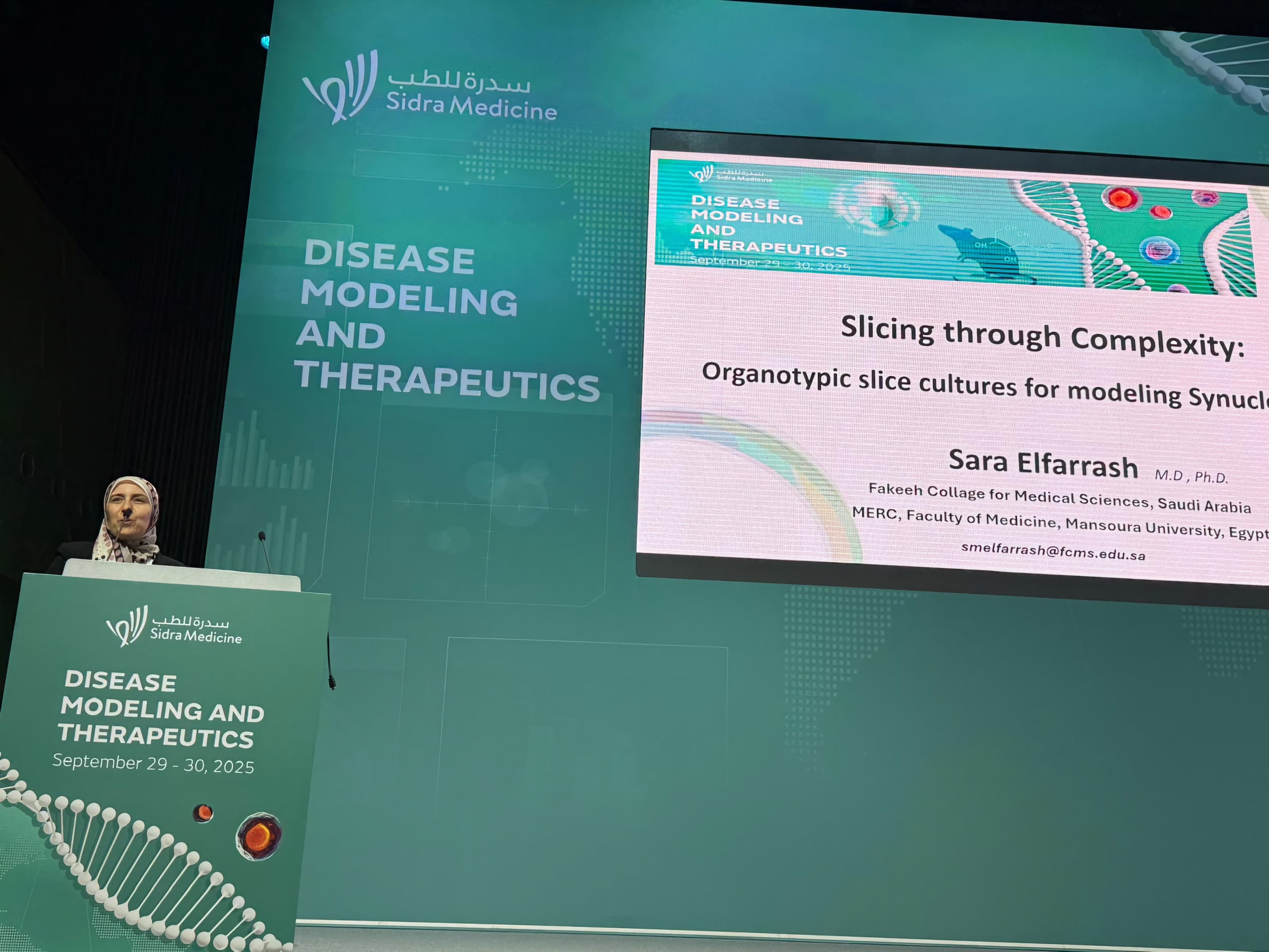 As part of its ongoing efforts to strengthen its international scientific presence, Fakeeh College of Medical Sciences participated in the Disease Modeling and Therapeutics (DMT) 2025 Conference, hosted by Sidra Medicine in Doha under the leadership of Prof. Essam Abdelalim and Dr. Luis R. Saraiva.
